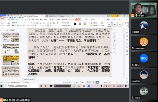 5月9日,公司开展了线上教学观摩课活动。本次观摩课是由公司俞秀玲副教授主讲的《国学经典导论》,200余名员工及部分老师线上观摩,活动由哲社学院副经理马雪莲主持。