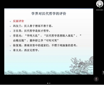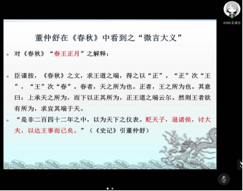 此次李智福老师开展的《中国哲学史》的观摩课主要探讨了董仲舒今文经学的兴起与谶纬化这个专题。从历史背景的介绍开始,通过今文经学与古文经学的对比、董仲舒所言之“微言大义”、董仲舒的“天人之学”等,清晰地讲述了汉代时期董仲舒哲学的兴起与发展。此次课程李老师讲述了自汉代以来中国哲学从不同层次有着不同的转变,对于理解中国哲学在不同时期的不同思想内容有着很大的帮助。