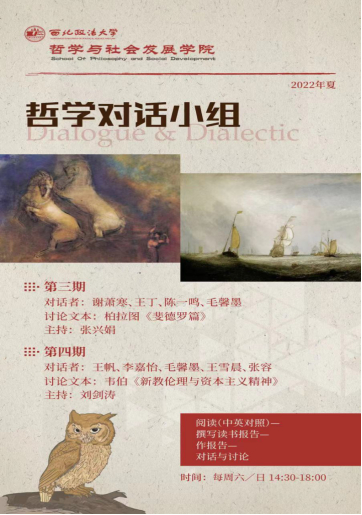 英国正版365官方网站哲学对话小组成立于2021年5月15日,张兴娟老师负责,2021年已举办两期;本学期开始举办第三、四期,第四期由刘剑涛老师主持,主题为韦伯的《新教伦理与资本主义精神》,近期即将开始。