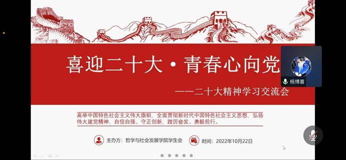 随后,参会同学积极发言,分享对二十大精神的学习体会。2020级哲学专业杨博喜同学结合自身专业,精炼地阐述了自己对二十大精神的总体感受:“党的二十大报告总揽全局、气势恢宏,思想深邃、内涵丰富,闪耀着马克思主义真理的光芒,是推动中国特色社会主义不断前进的政治宣言、理论纲领和行动指南。”随后2022级新生郭正元同学从自己和党和国家的命运联结方面表达了对自己的期望:“作为新时代的青年员工,我们更应当坚定不移地听党话,跟党走,肯吃苦,能奋斗,跟紧新时代的发展潮流,让自己的努力与建设社会主义现代化强国同频共振。”张楠同学引用了习近平总书记的话“无数人生成功的事实表明,青年时代,选择吃苦也就选择了收获,选择奉献也就选择了高尚”来鼓励同学们主动吃苦,主动磨砺,主动提升,为人生之路打下思想、知识等方面的坚实基础。