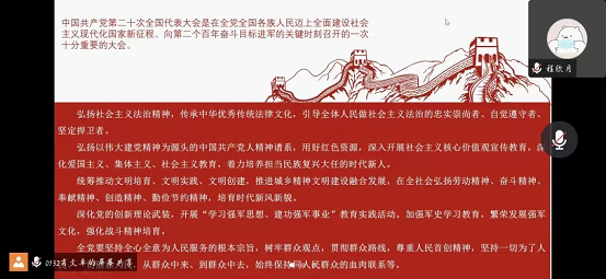 程欣月同学首先带领大家深刻学习领会了二十大精神内涵,重点学习与讨论了“高举中国特色社会主义伟大旗帜,全面贯彻新时代中国特色社会主义思想,弘扬伟大建党精神,自信自强、守正创新,踔厉奋发、勇毅前行,为全面建设社会主义现代化国家、全面推进中华民族伟大复兴而团结奋斗”的二十大主题。