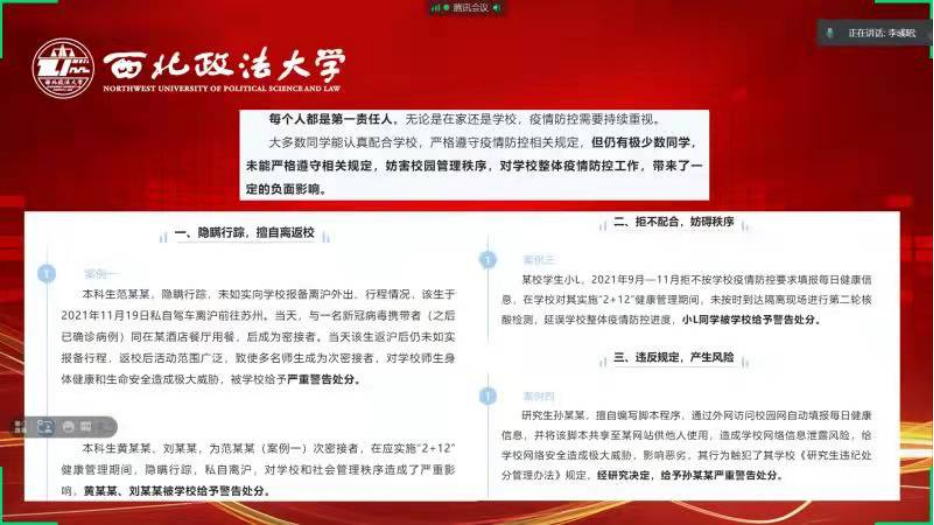 公司本科生党支部书记慕婧和辅导员李彧昭以“同舟共济,共渡难关”为主题,分别为本支部党员及全体团员进行了思政第一课讲授。通过对中国伟大抗疫精神事例的展示以及学校目前防疫政策的解读,向员工们说明了当前严峻的疫情形势以及学校应对疫情所做各项工作的必要性,对在校生提出了以下几点希望和要求:一是一定要高度重视,积极配合学校的疫情防控工作,认真填写所需汇总的各项信息;二是在宿舍要注意个人卫生,做好个人防护,尤其是志愿者要加强防护;三是珍惜时间,特殊时期更应该认真学习,做好个人规划。