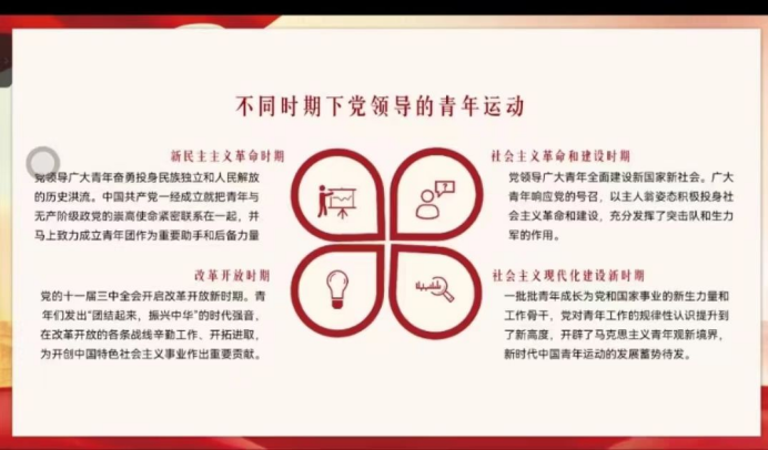 本次会议从中国青年运动史的不同阶段出发,带领同学深入学习百年青年运动史。会议介绍了新民主主义革命时期、社会主义建设时期、改革开放新时期以及社会主义新时代时期不同的阶段特征。