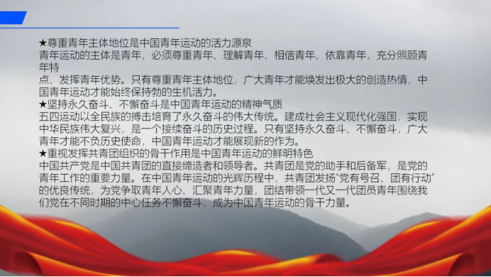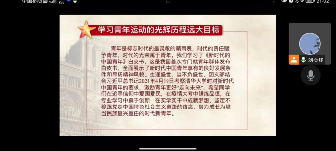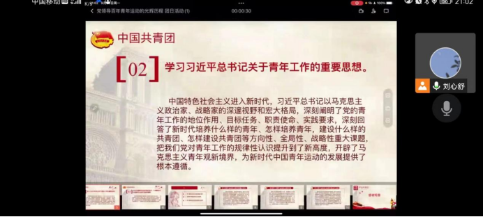 会上,团支书刘心舒从“学习中国共产党对于领导广大青年在革命中的建设和领导”、“学习习近平总书记关于青年工作的重要思想”、“百年中国青年运动历程的启示,引领新时代中国青年运动书写崭新篇章"三个主题切入,带领大家感受中国青年如何在党的领导下创立伟业。在讲述结束后,同学们也进行了激烈讨论,纷纷表示青春是每个人必经的一条道路,途中充满荆棘与坎坷,而我们青年人就是要破除阻碍,敢于前进。