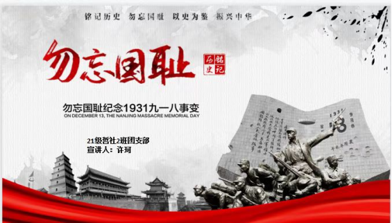 同学们通过九一八事变的概述和图文材料,来对九一八事件进行历史性回顾沉思,接着,团支书同学就九一八事件的影响和后世纪念,向同学们作以介绍。会议的最后,同学们纷纷发表了自己参加此次会议的感悟,对历史、对青年责任的看法。同学们提到,我们要牢记历史警示,增强忧患意识,始终居安思危,勇干战胜风险挑战,树立人类命运共同体意识,向着中华民族伟大复兴的中国梦奋勇前进!